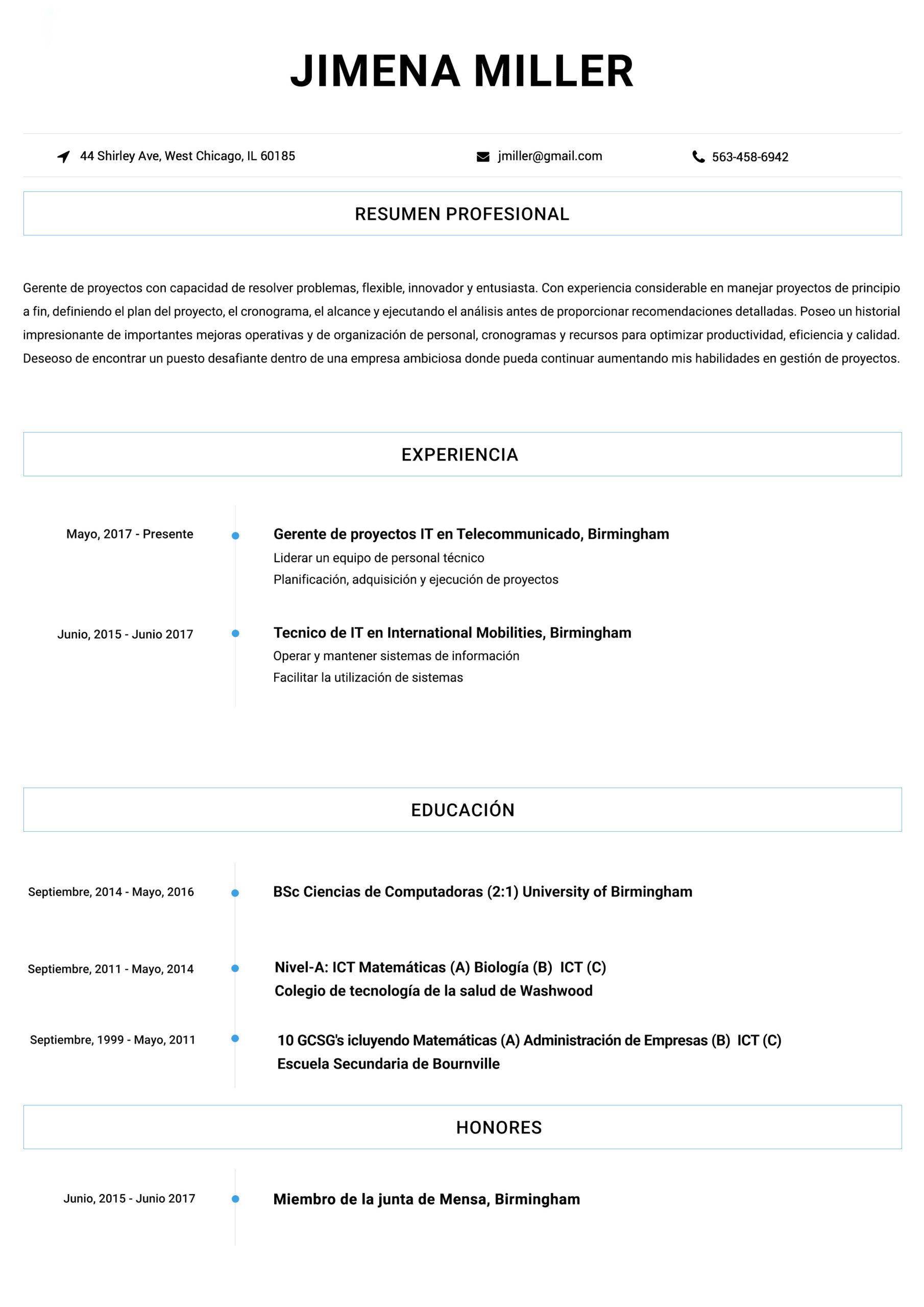 Pero conseguir que la información inicial de tu currículum sea correcta requiere más habilidad. Te recomendamos que utilices un objetivo o un resumen. Estas breves secciones te permitirán causar rápidamente una buena primera impresión al centrar la atención del reclutador en tus mejores atributos. Si consigues causar una primera impresión así, es más probable que te concedan el beneficio de la duda. Resume Build ofrece numerosos ejemplos de currículos para darte algunas ideas para el objetivo o el resumen de tu currículo.