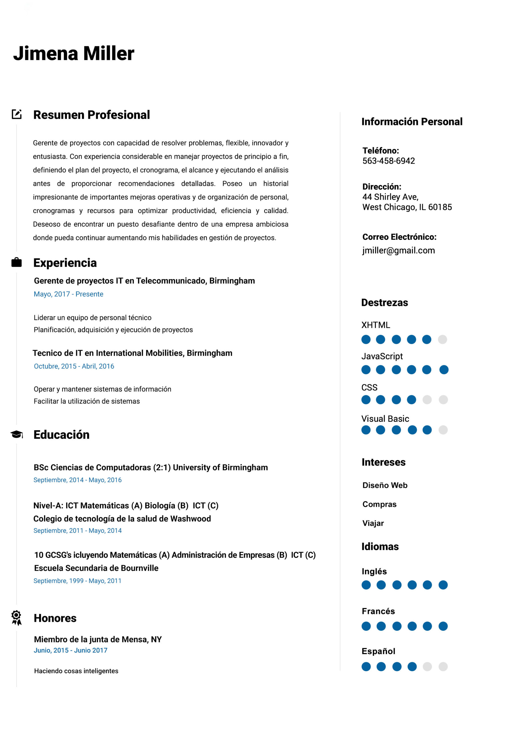 También tendrás que elegir entre una plantilla de currículum a una o dos columnas. Por lo general, dividir una sola sección en dos columnas puede resultar confuso para el lector. Sin embargo, si tienes muchos tipos de información que transmitir, nuestro diseño a dos columnas puede ayudarte a hacerlo de una forma organizada que facilite al lector digerir toda la información.
